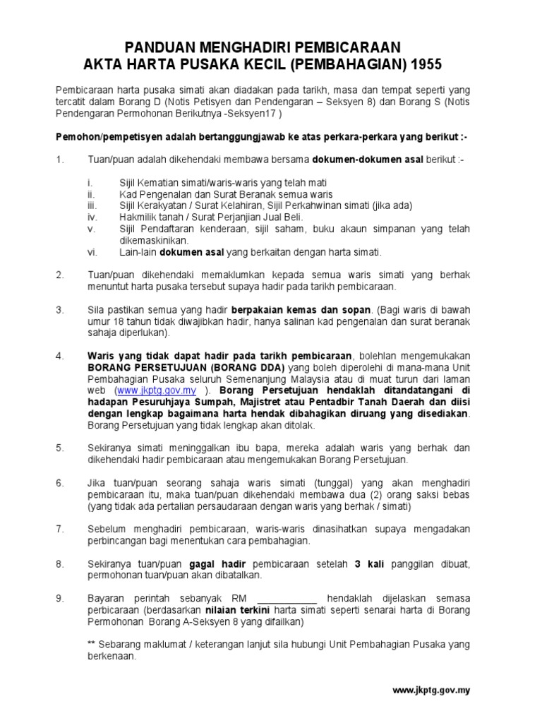 Semua dokumen asal hendaklah dibawa pada hari pembicaraan yang akan ditetapkan kemudian dan diberitahu melalui notis petisyen dan pendengaran - seksyen 9 akta 98 d. Untuk makluman di Malaysia urusan pentadbiran harta pusaka adalah dijalankan mengikut undang-undang sivil. Senarai Semak Permohonan Pengambilan Tanah.